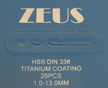 Zeus High Speed Steel, Titanium coated Metric Drill Set, 1.0mm to 13.0mm, 0.5mm increments.